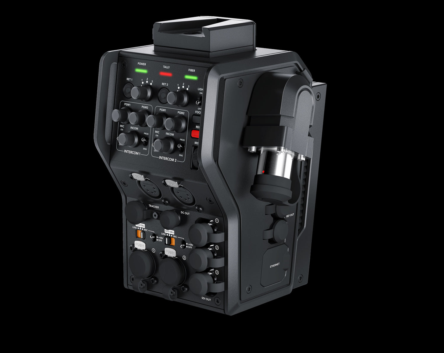 The Blackmagic Design Camera Fiber Converter attaches to the back of your URSA Mini or URSA Broadcast camera. In addition to converting all of the audio, video, camera control and talkback into fiber, it also adds professional studio camera controls to the back of your camera. You get control for return feeds, dual intercom controls with the ability to mix in program audio, record, focus and iris controls, headset connectors, audio and more. The camera converter also includes a VLock mount plate on the top for attaching accessories such as a professional Blackmagic Studio Viewfinder. The Blackmagic Camera Fiber Converter has connections for your Ultra HD camera feed, 3 HD return feeds, full remote camera control, PTZ, multiple channels of talkback, tally and more!