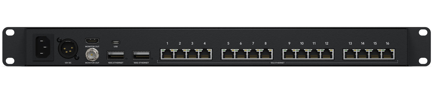 The Blackmagic Design Ethernet Switch 360P delivers high performance with low latency, featuring 16 fast 10G Ethernet ports and 2 high-speed 100G ports. Designed for 2110 IP video workflows, it includes rear Ethernet connections and supports NMOS protocol for seamless integration.