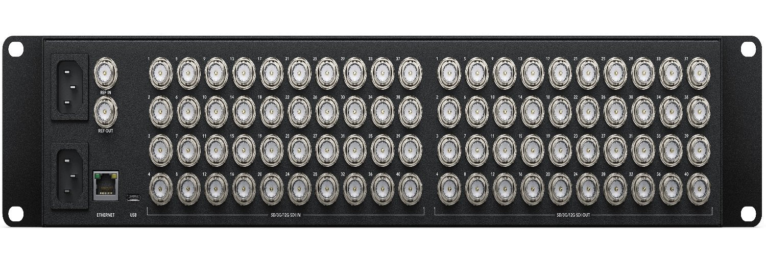 The Blackmagic Design Videohub 40x40 12G offers a large-scale, zero-latency 12G-SDI video routing solution, supporting SD, HD, and Ultra HD signals simultaneously. This versatile router includes re-clocking, a control panel, and external Ethernet control for seamless operation across all video formats.